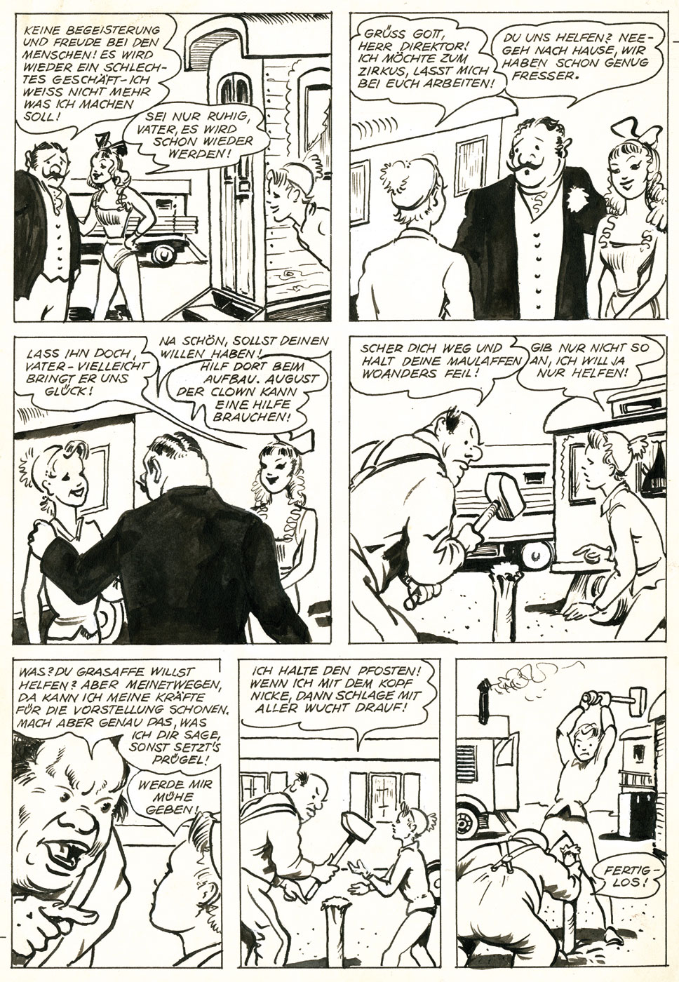 DORUL VAN DER HEIDE: Till Eulenspiegel kommt zum Cirkus published in the Kauka Verlag in Eulenspiegel #7, 1954, complete 12-page-story! (shown here are only 4), ŕ 19,3 x 28 cm