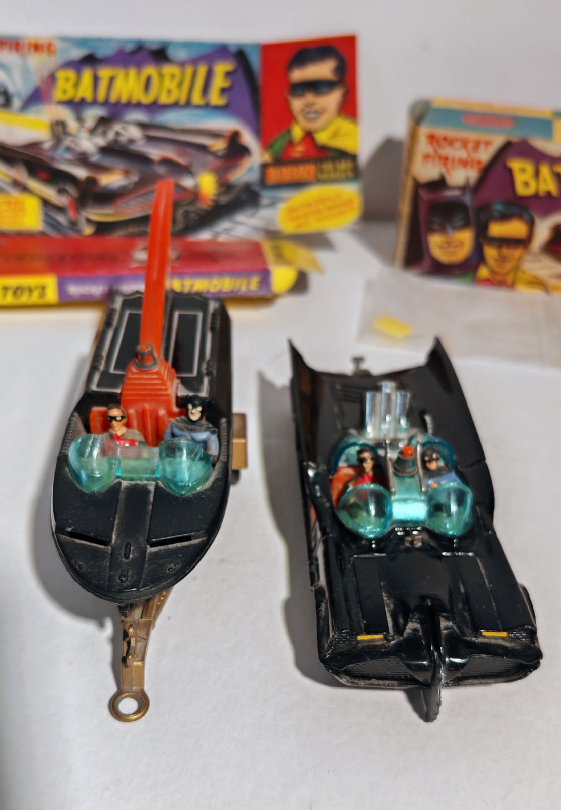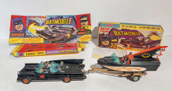 Batmobile und Batboat von Corgi Toys, 1960er Jahre (?), mit Antenne, Munition und Replika-Verpackungen