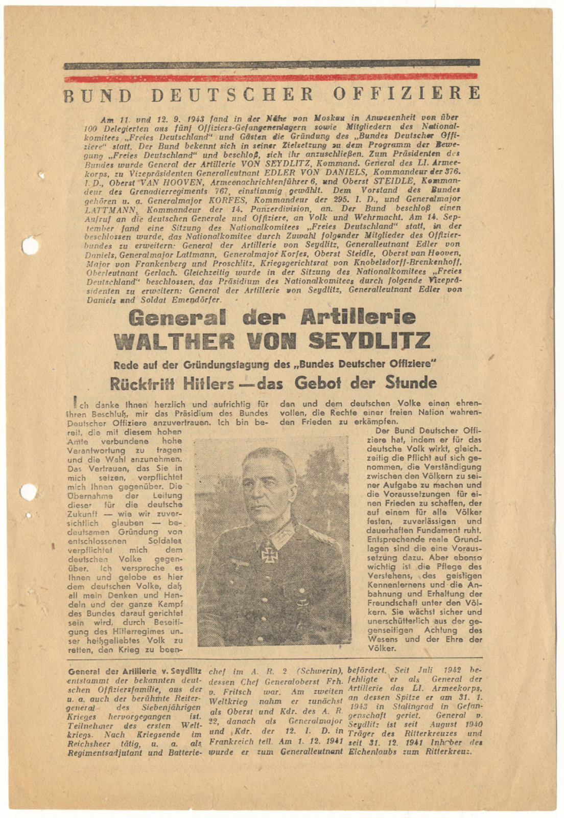Bund deutscher Offiziere / Nationalkomitee freies Deutschland, General der Artillerie Walther von Seydlitz, Flugblatt von der Sowjetischen Armee ab dem 30. 9. 1943 über der deutschen Ostfront abgeworfen, dazu die amtliche, gedruckte Übersetzung für sowjetische Behörden