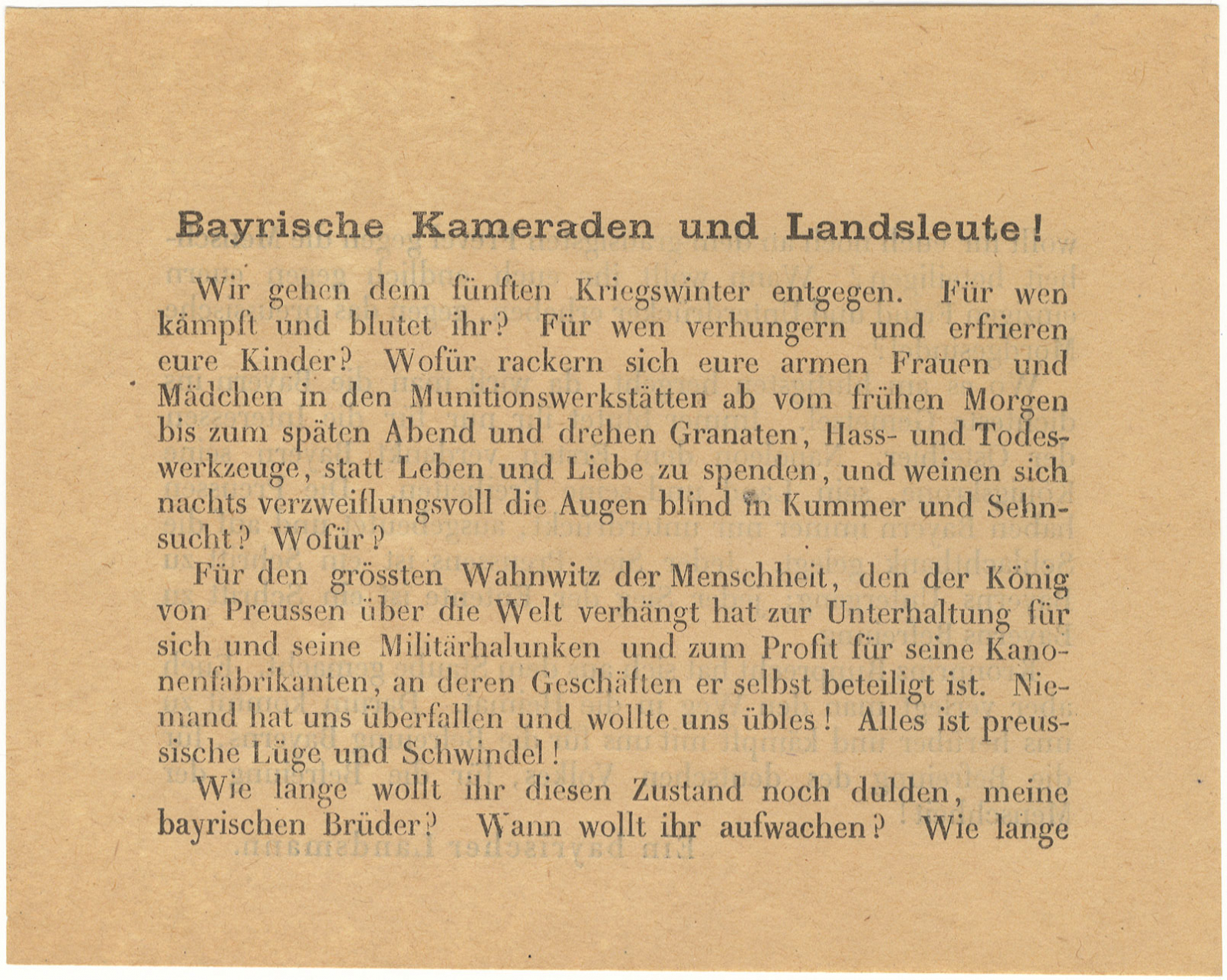 Bayerische Kameraden und Landsleute!, französisches Flugblatt / Feindpropganda aus dem ersten Weltkrieg, Frühjahr 1918
