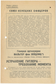 Bund deutscher Offiziere / Nationalkomitee Freies Deutschland, General der Artillerie Walther von Seydlitz Russian leaflet in German language, thrown off on German troops from October 30. 9. 1943 at the Eastern front
