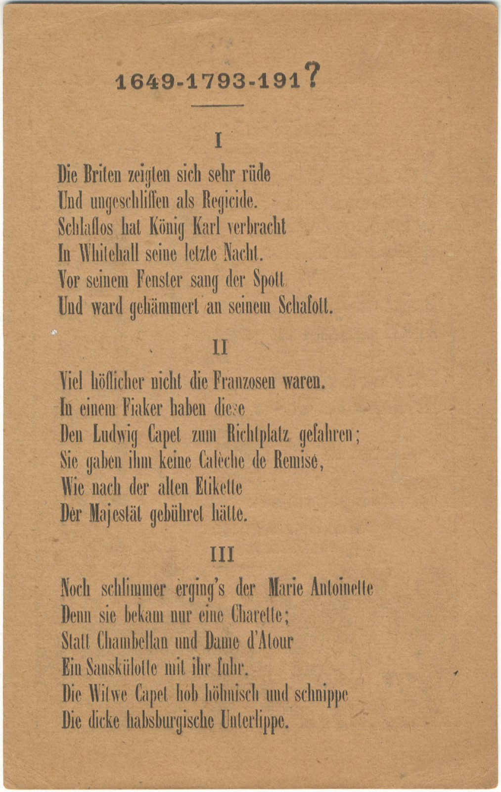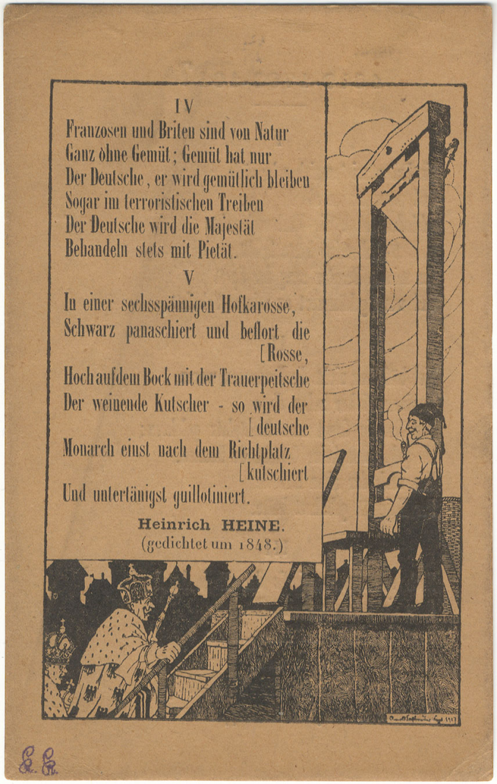 Heinrich Heine, the German poet, wrote this poem when in exile in Paris in 1848. Heine describes in the last, the Vth verse, how the German monarch will be decapitated. The drawing, made by a French artist, illustrates how this will come about. Wilhelm 2, the German Kaiser, and his crown prince are being led to the guillotine. The "German Michel", symbol for the ordinary German, wearing a pointy cap, is waiting happily to do the job of the executioner.