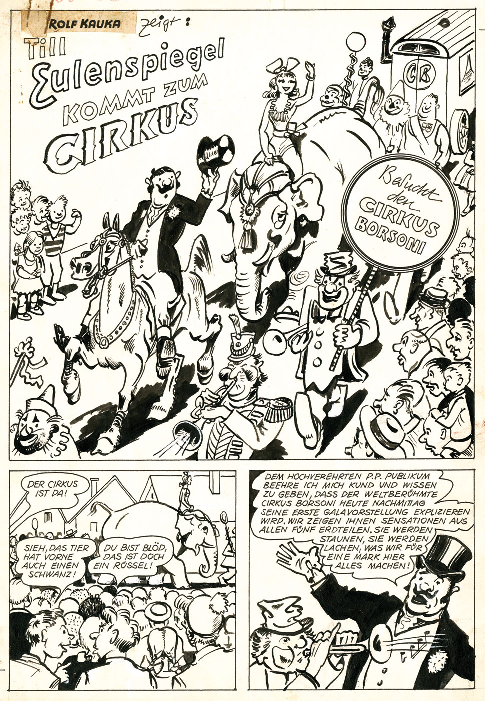 DORUL VAN DER HEIDE: Till Eulenspiegel kommt zum Cirkus published in the Kauka Verlag in Eulenspiegel #7, 1954, complete 12-page-story! (shown here are only 4), ŕ 19,3 x 28 cm