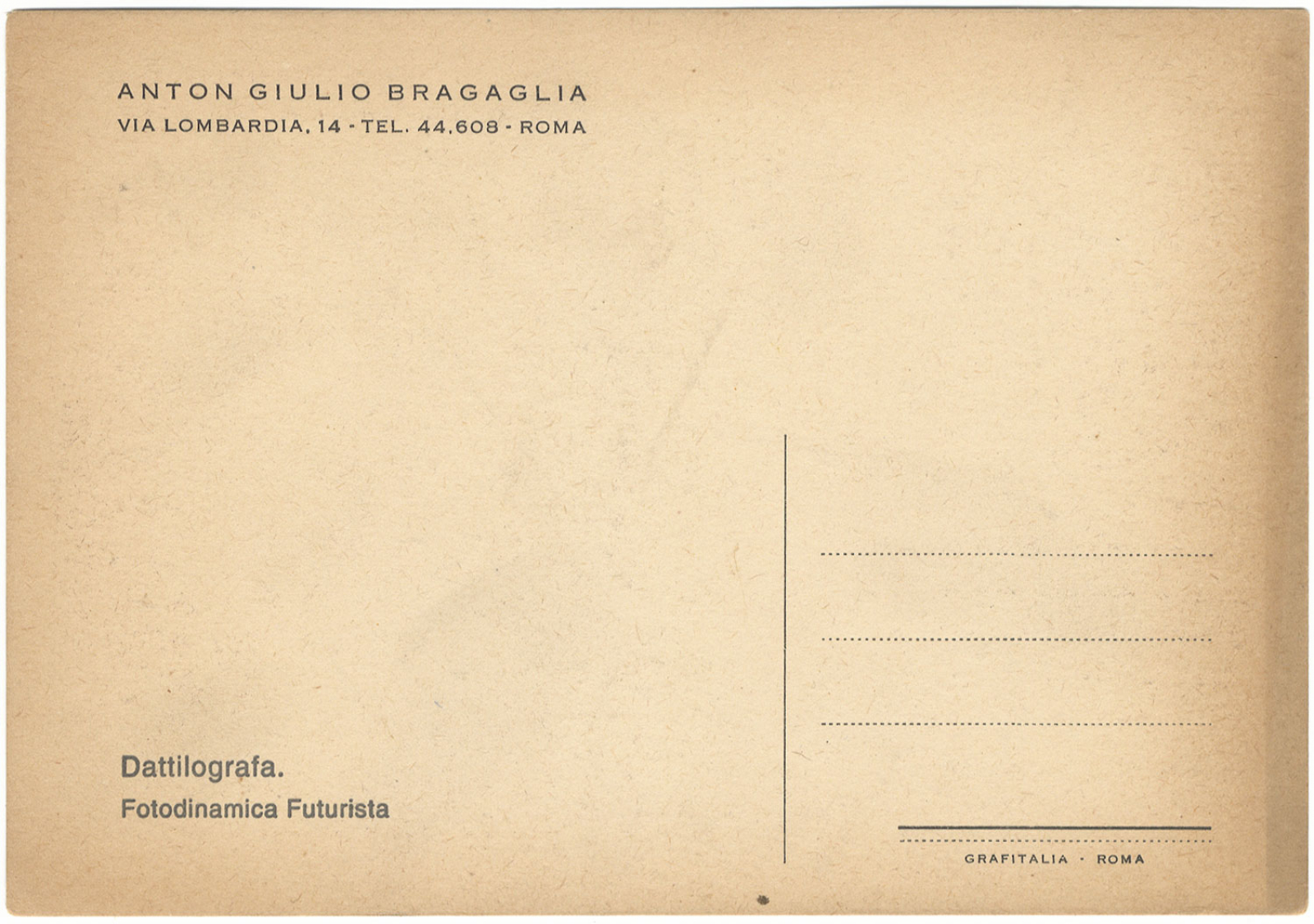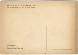 Postkarten von Bragaglia sind oft eine Serie fotodinamischer Bilder von Anton Giulio Bragaglia aus der futuristischen Periode, die in den Jahren 1911-1913 entstanden sind. Auf der Rückseite tragen sie die Adresse und die facsimile-Signatur von Bragaglia. Art der Karten: Fotodinamica Futurista (fotodynamische futuristische Drucke).Künstler: Anton Giulio Bragaglia.Zeitraum: Hauptsächlich 1911-1913.Faksimilesignatur von Bragaglia.Adresse: „Via Lombardia, 14, Rome“.