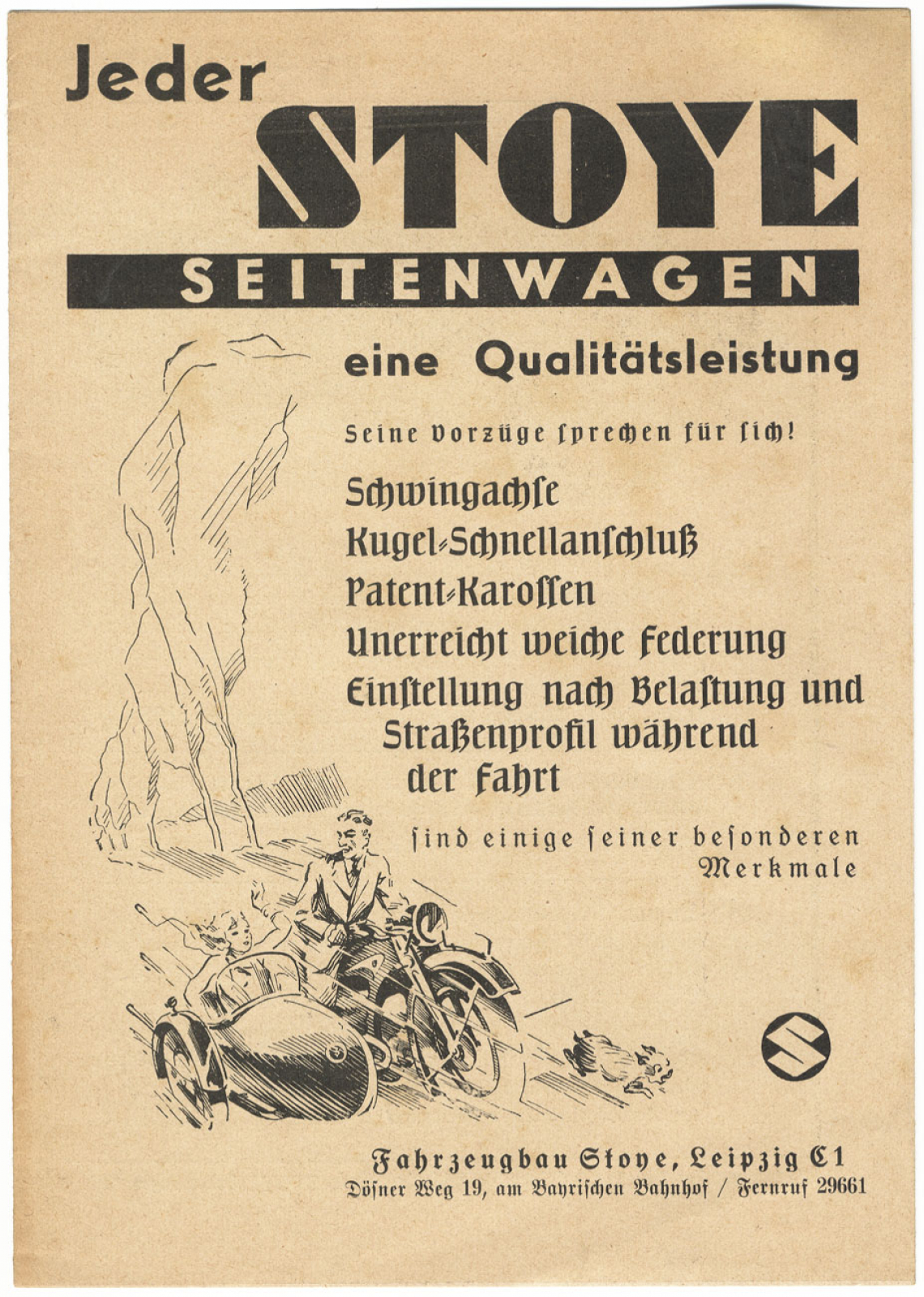 Jeder Stoye Seitenwagen eine Qualitätsleistung, Katalog als Faltblatt, ca. 1920er oder frühe 30er Jahre