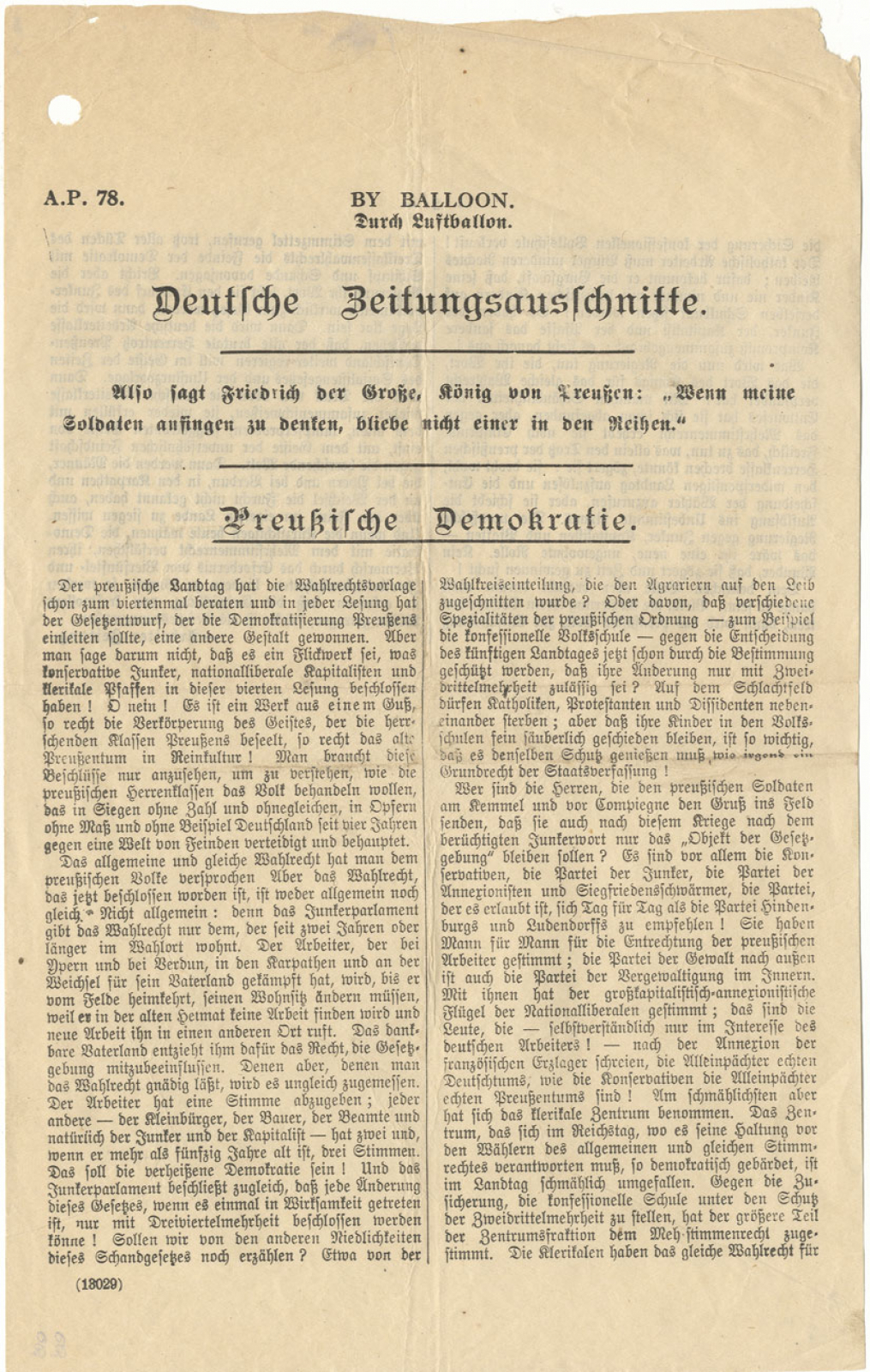 17,4 x 28 cm, eingesetzt ab September 1918, Code: A.P.78., beidseitig bedruckt, abgeworfen durch Luftballon